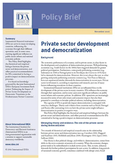 This Policy Brief highlights the theoretical and empirical linkages between the private sector and democratization, and offers practical recommendations for IFIs committed to having a positive impact on democratization processes.