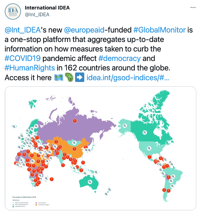 Another serious concern was how government emergency responses to the pandemic would affect democracy and human rights, and how authoritarian regimes would use the pandemic as a pretext to further enhance their power. To enable democratic actors to hold policymakers to account, International IDEA developed a Global Monitor that continuously tracks the impact of Covid-19 measures on various aspects of democracy and human rights in 162 countries.
