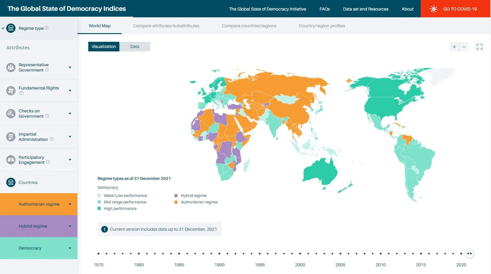 International IDEA’s Global State of Democracy Indices (GSoDI) is a dataset that measures 116 individual indicators of 173 countries’ democratic performance. The GSoDI’s unique framework draws on 12 high-quality sources to produce a rich and methodologically robust dataset. Instead of ranking countries on a unidimensional index, the GSoDI comprises five main attributes—Representative Government, Fundamental Rights, Checks on Government, Impartial Administration and Participatory Engagement—and 16 subattributes, all related to different aspects of democracy. This allows for a nuanced analysis of democratic performance, based on the belief that no single ideal type of democracy exists. The use of multiple datasets also mitigates the risk of bias.