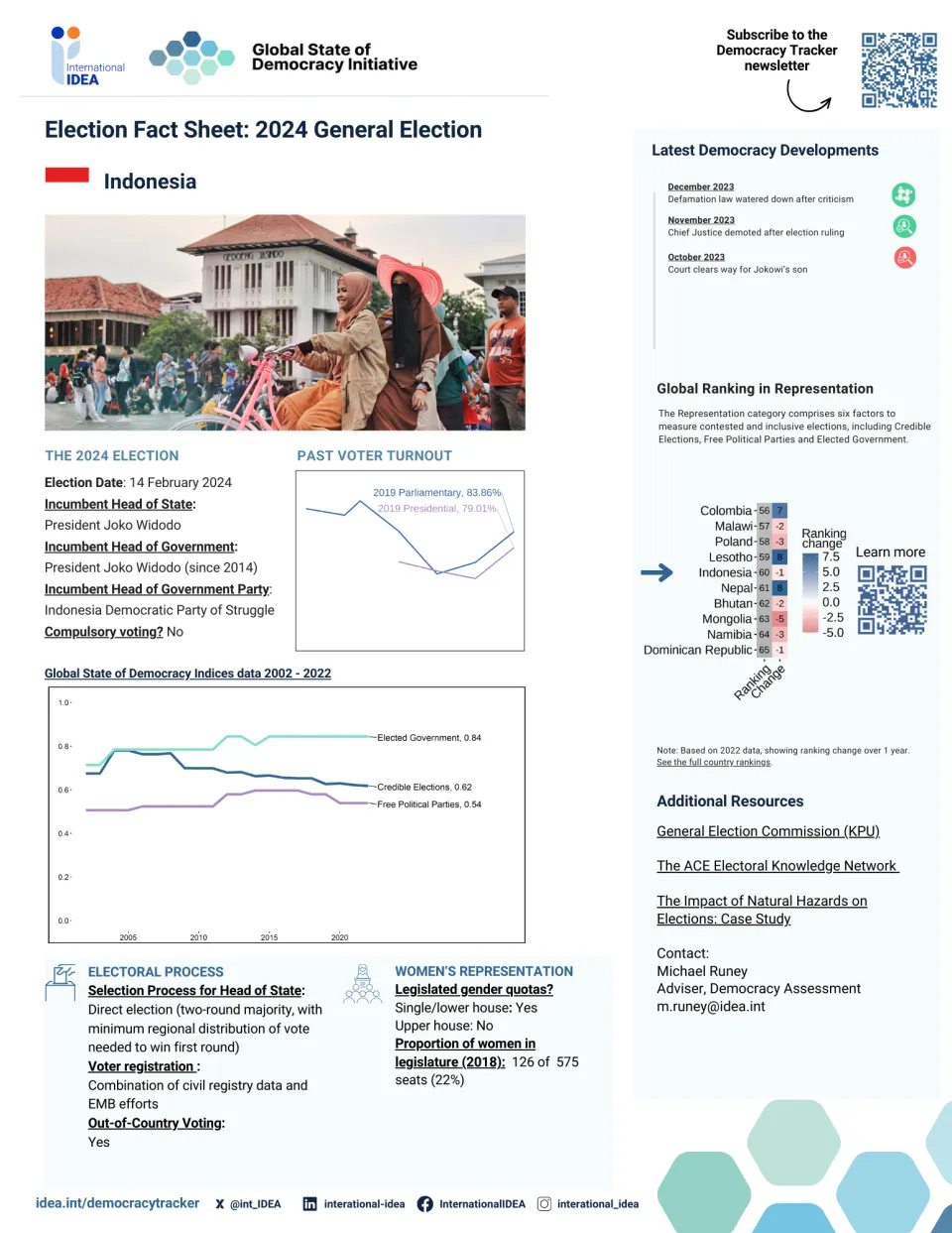 The Republic of Indonesia performs in the mid-range in Representation, Rights and Rule of Law and is high-performing in Participation. It ranks in the top 25 per cent globally in Civil Society, Civic Engagement and Electoral Participation. Compared to five years prior, Indonesia has experienced declines in Access to Justice, Credible Elections, Effective Parliament, Judicial Independence and Predictable Enforcement. The fourth most populous nation in the world and home to the largest population of Muslims globally, Indonesia has a service-based economy largely dependent on domestic consumption.