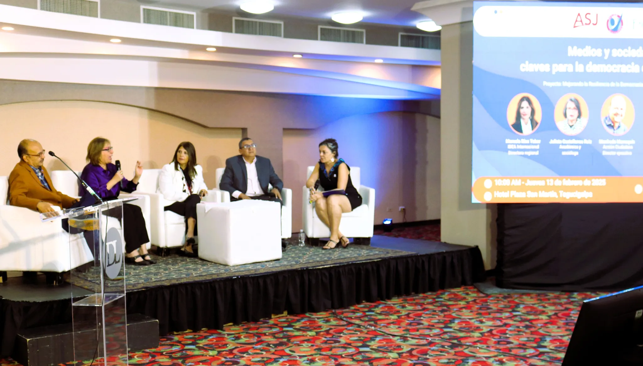 El conversatorio fue moderado por Blanca Blanco, gerente de programas para IDEA Internacional, y contó con los aportes de: Marcela Ríos Tobar, directora regional de IDEA Internacional para América Latina y el Caribe; Carlos Hernández, director ejecutivo de ASJ; Julieta Castellanos Ruiz, académica y socióloga hondureña; Manfredo Marroquín, director ejecutivo de Acción Ciudadana Guatemala y Thelma Mejía, periodista hondureña y fundadora del Foro Ciudadano y del Comité por la Libertad de Expresión.
