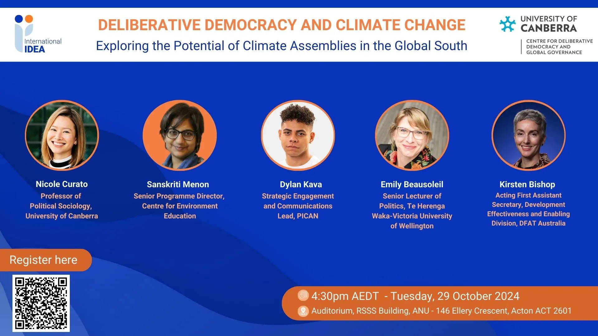 On 29 October 2024, International IDEA and the Centre for Deliberative Democracy and Global Governance at the University of Canberra will organize a panel to discuss findings of the report, explore challenges and innovations of climate-related deliberative practices and the potential of climate assemblies in Asia and the Pacific.