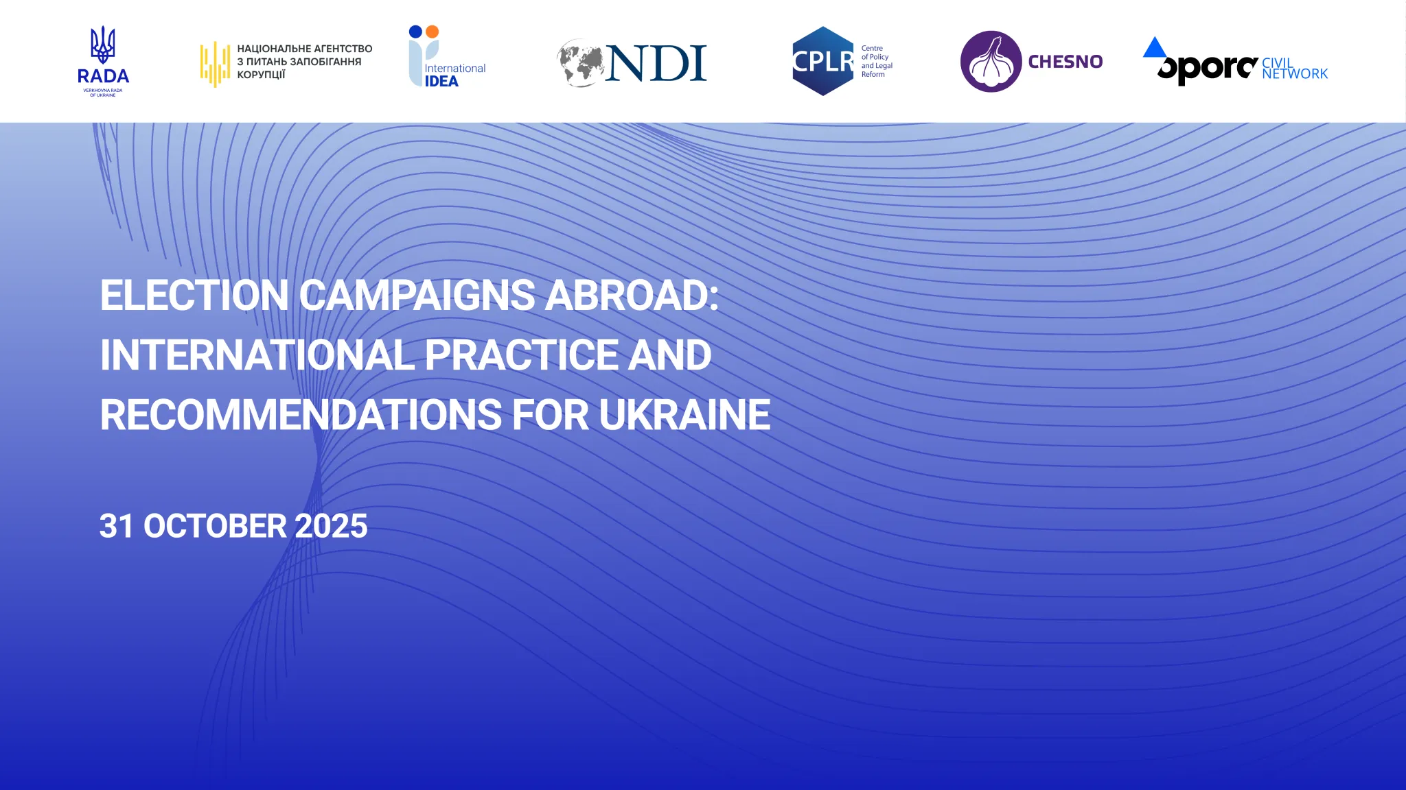 This event is co-organized by the International Institute for Democracy and Electoral Assistance (International IDEA), along with the Verkhovna Rada Committee on Organization of State Power, Local Self-Government, Regional Development, and Urban Planning, the National Democratic Institute (NDI), the National Agency for Corruption Prevention (NACP), the Center for Political and Legal Reforms (CPLR), the OPORA Civic Network, and the Chesno Movement.