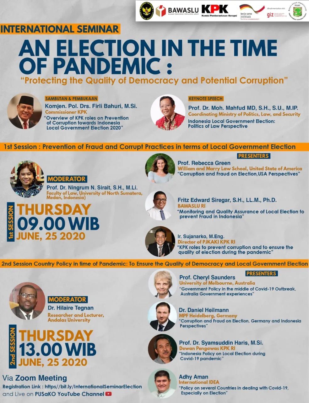 The Indonesian Coordinating Ministry for Politics, Law, and Security, the Corruption Eradication Commission of Indonesia (KPK), the Election Supervisory Commission of the Republic of Indonesia (Bawaslu RI), the Center for Constitution Studies (PUSaKO) Faculty of Law Andalas University and the Deutsche Gesellschaft für internationale Zusammenarbeit (GiZ) will organize an International Webinar on Thursday, 25 June 2020 through Zoom Application System.