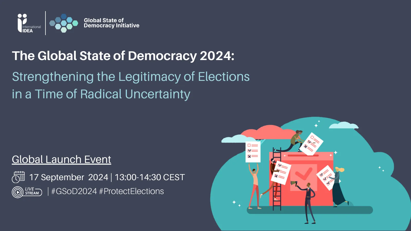 Mark your calendar for 17 September at 13:00-14:30 CEST and watch the event live on International IDEA's YouTube channel. Join the discussion and share your thoughts using the hashtags: #GSoD2024 #protectelections.