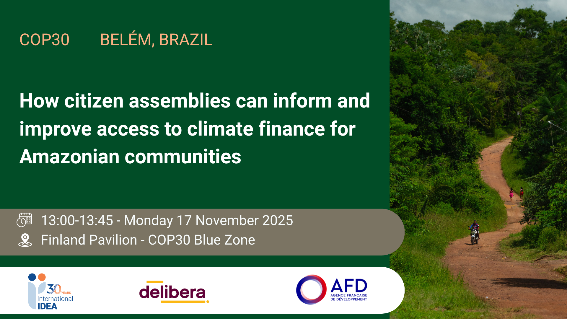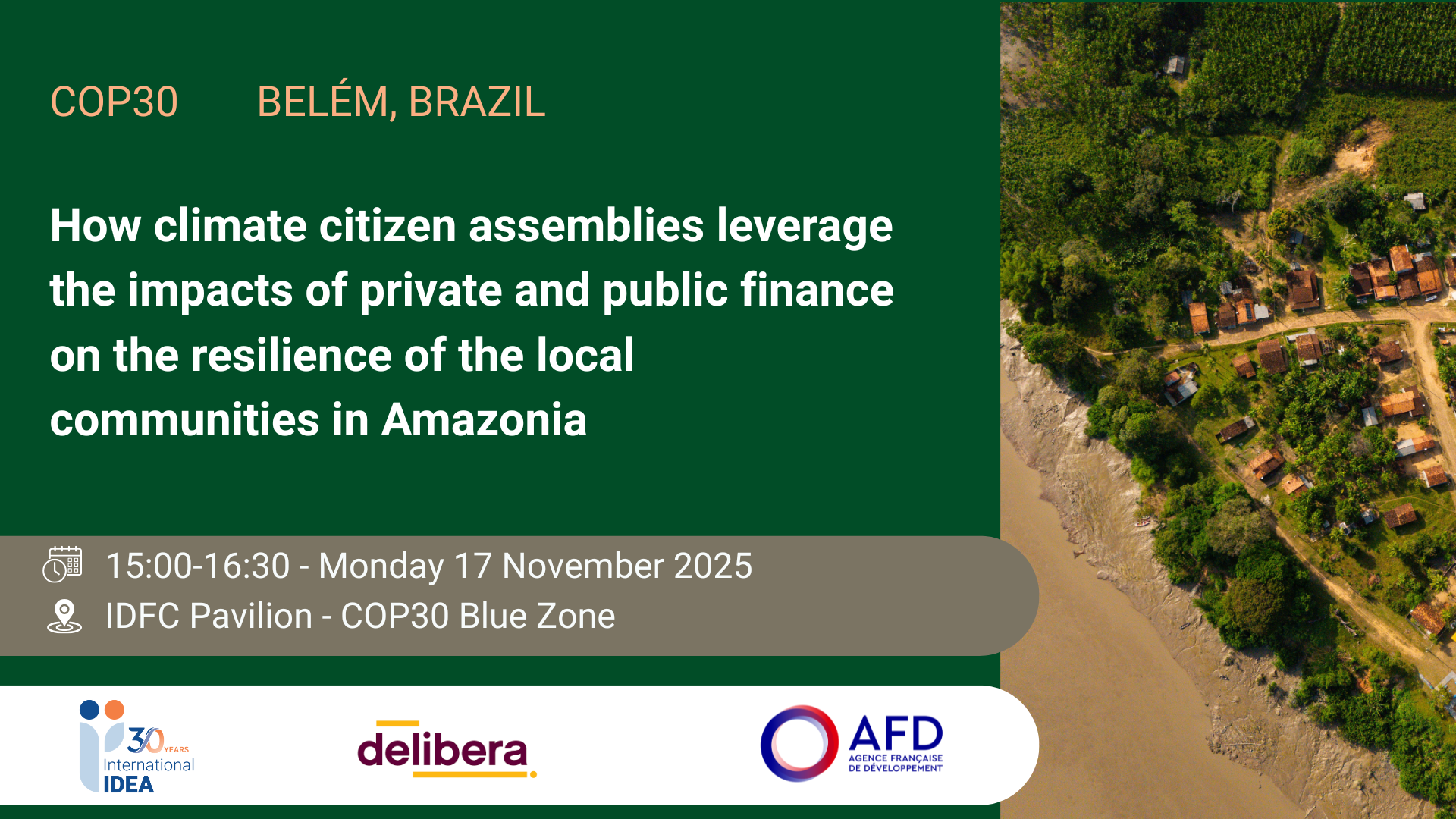 Reaching the Paris Agreement goals requires innovation in democratic governance, including on citizen participation and deliberation. International IDEA will present the experiences and outcomes from three climate assemblies organized in the state of Pará, Brazil, in the lead-up to COP30, with partner organizations Delibera Brasil and Agence Française de Développement. Read the case study report (available soon) and join us for engaged discussions in Belém on 12 November (IARAÇU River Caravan, outside the COP30 venue) and two events on 17 November (Finland Pavilion & IDFC Pavilion, COP30 Blue Zone and online).