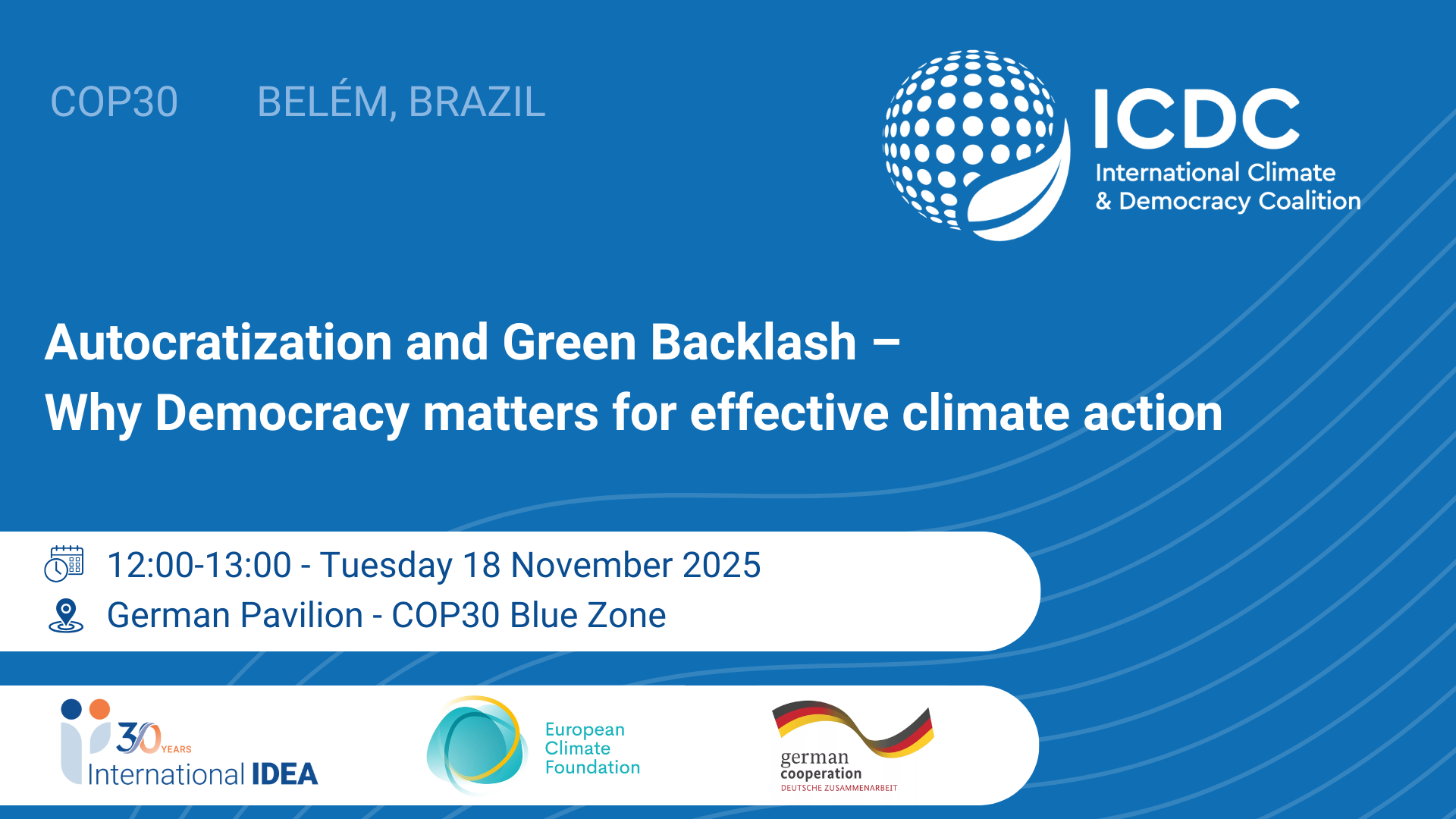 In addition, International IDEA will engage with partners of the newly established 'International Climate and Democracy Coalition' on the overall nexus between climate crisis and democratic governance, against the current backdrop of growing autocratization. Join us on 18 November for a high-level event and launch of the Coalition (German Pavilion, COP30 Blue Zone and online).