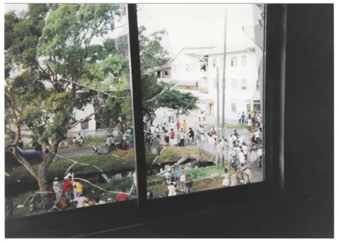 Despite the ten-month postponement and the assistance programs, the election was placed in serious jeopardy on election day by a violent attack on the headquarters of the Election Commission in Georgetown. Around midday, several hundred people gathered outside the Election Commission building. They chanted anti-Commission slogans and began hurling stones and bricks at the facility. Nonessential staff were evacuated from the building, as the headquarters were protected by only a handful of unarmed constables.