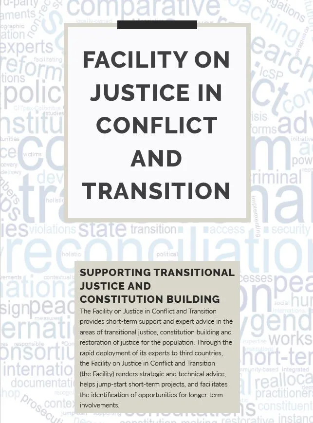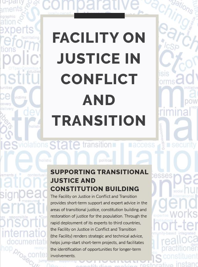 The Facility on Justice in Conflict and Transition provides short-term support and expert advice in the areas of transitional justice, constitution building and restoration of justice for the population. Through the rapid deployment of its experts to third countries, the Facility on Justice in Conflict and Transition (the Facility) renders strategic and technical advice, helps jump-start short-term projects, and facilitates the identification of opportunities for longer-term involvements.