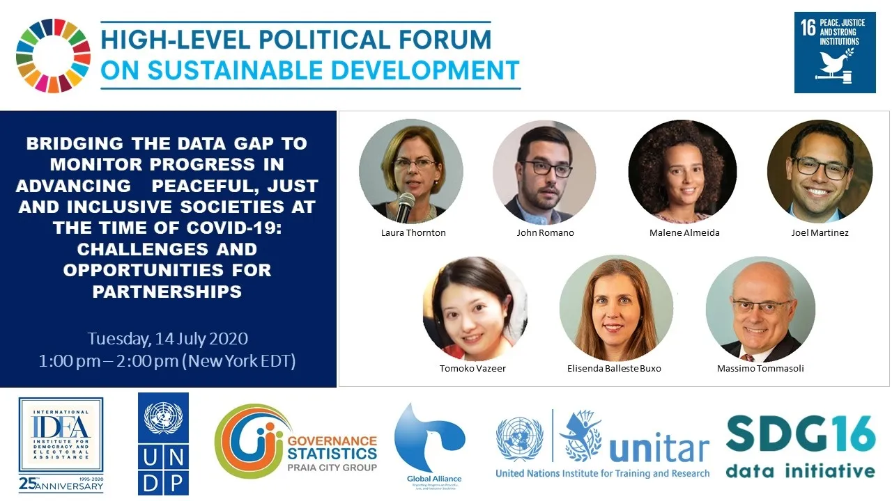 In the margins of the High Level Political Forum (HLPF) 2020, under the auspices of the Economic and Social Council (ECOSOC), the International Institute for Democracy and Electoral Assistance (International IDEA) held a virtual side-event entitled “Bridging the data gap to monitor progress in advancing peaceful, just and inclusive societies at the time of COVID-19 – challenges and opportunities for partnerships” on Tuesday, 14 July, from 1:00 pm – 2:00 pm (New York EDT). The event was organized as part of the SDG16 Data Initiative, in collaboration with the United Nations Institute for Training and Research (UNITAR), the United Nations Development Programme (UNDP), the Global Alliance for Reporting Progress on Peaceful, Just and Inclusive Societies, and the Praia City Group on Governance Statistics.