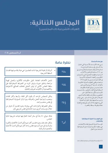 ولهذه الأسباب، فإن لدى العديد من البلدان مجلسا ً تشريعيا ً ثانياً، يكون في معظم الأحيان ذا تركيبة ووظائف وصلاحيات مختلفة ـ لتحقيق التكامل والتوازن مع المجلس الرئيسي. لكن في العديد من السياقات، يمكن للمجلس الثاني أن يضيف تعقيدات، وتأخيرات ونفقات إضافية دون أن يحقق ميزات إضافية. إن هيئة تشريعية مكونة من مجلس واحد حسن التصميم، مع توازنات وضوابط من خارج البرلمان، قد تكون أكثر ملاءمة.