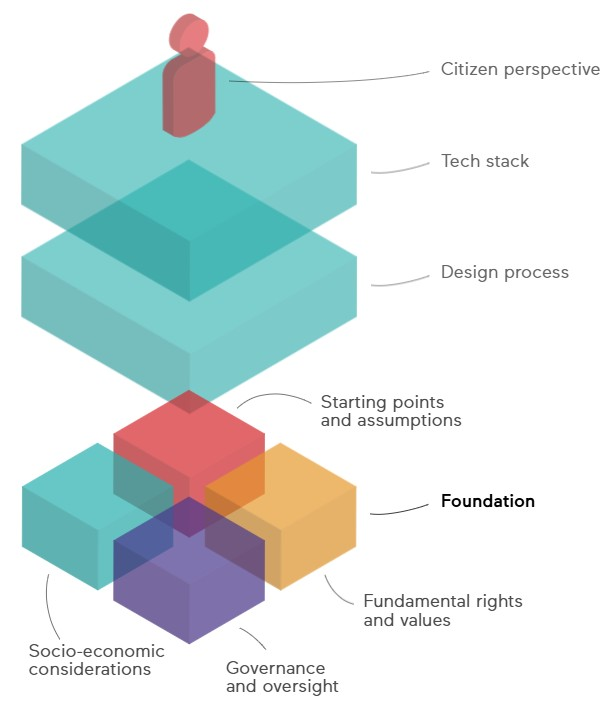 At the base of the Democracy Stack, digital tools and services should be grounded in decisions that resound in all layers of the stack. This includes ensuring that fundamental rights and values are respected (Waag Futurelab n.d.f), that all interested stakeholders are involved, that it is clear to what end you are digitalizing (Waag Futurelab n.d.h), and that governance and oversight are included (Waag Futurelab n.d.g).