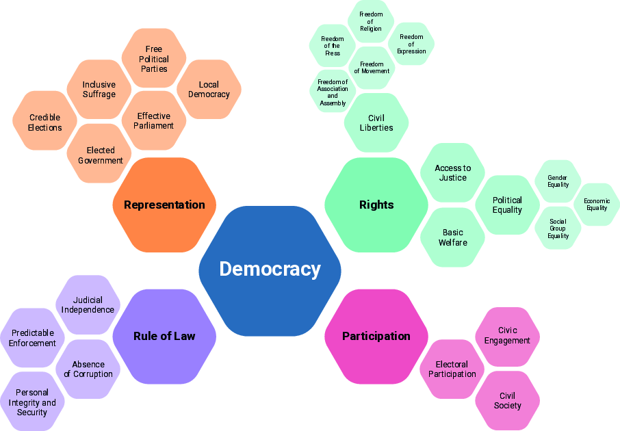 - Representation. This category includes credible elections free of disinformation, foreign interference or the distortion of generative AI; free and fair competition between political parties; a balance of power between the legislature and executive; inclusive suffrage; and the ability to practise democracy at the local level. For example, citizens would potentially be better represented if the terms of governance for the information platforms that, de facto, determine the extent of their informed participation in democratic processes were determined by an intentional multi-stakeholder process, rather than by a small group of corporate executives (Schaake 2020).