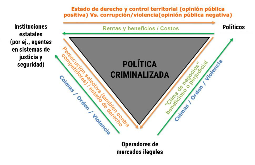 ¿Cómo es posible abordar, entonces, las implicancias de la expansión de mercados ilegales para los procesos electorales, la integridad de la institucionalidad democrática y la capacidad del Estado en América Latina? Con base en nuestro trabajo previo (Feldmann y Luna, 2023) sostenemos que es fundamental analizar las características y dinámicas de lo que denominamos “política criminal” o “política criminalizada.” La definimos como: “[L]a acción o actividad interrelacionada entre políticos, miembros del crimen organizado y agentes del Estado con miras a la consecución de sus agendas e intereses en materia económica, política y personal” (traducción de los autores, Feldmann y Luna 2023, pág. 2; sobre este punto ver también Barnes, 2025).