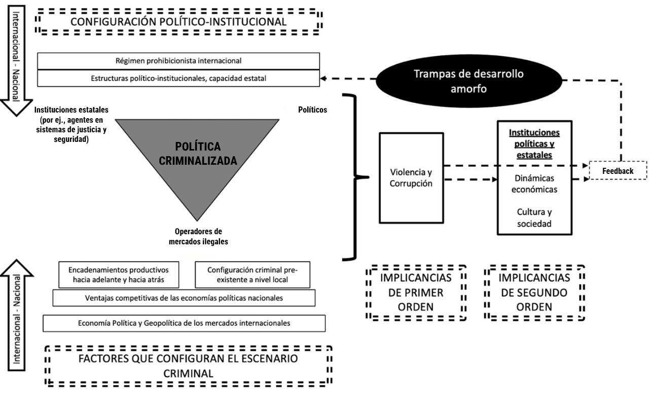 De la interacción entre estos dos tipos de factores, cabría observar equilibrios específicos de política criminalizada, los cuales se asocian, en sus implicancias de primer orden, en términos de altos niveles de violencia, corrupción, o ambos fenómenos. Finalmente, asumimos que más allá de dichas consecuencias primarias, los tipos de política criminalizada que caracterizan cada caso también repercuten a través del tiempo, en la reconfiguración de factores político-institucionales, así como en la economía y cultura política predominante en cada contexto municipal, estatal o nacional donde incide la actividad ilegal. Se espera que dicha reconfiguración vaya generando cambios intertemporales en la estructura de la política criminalizada.
