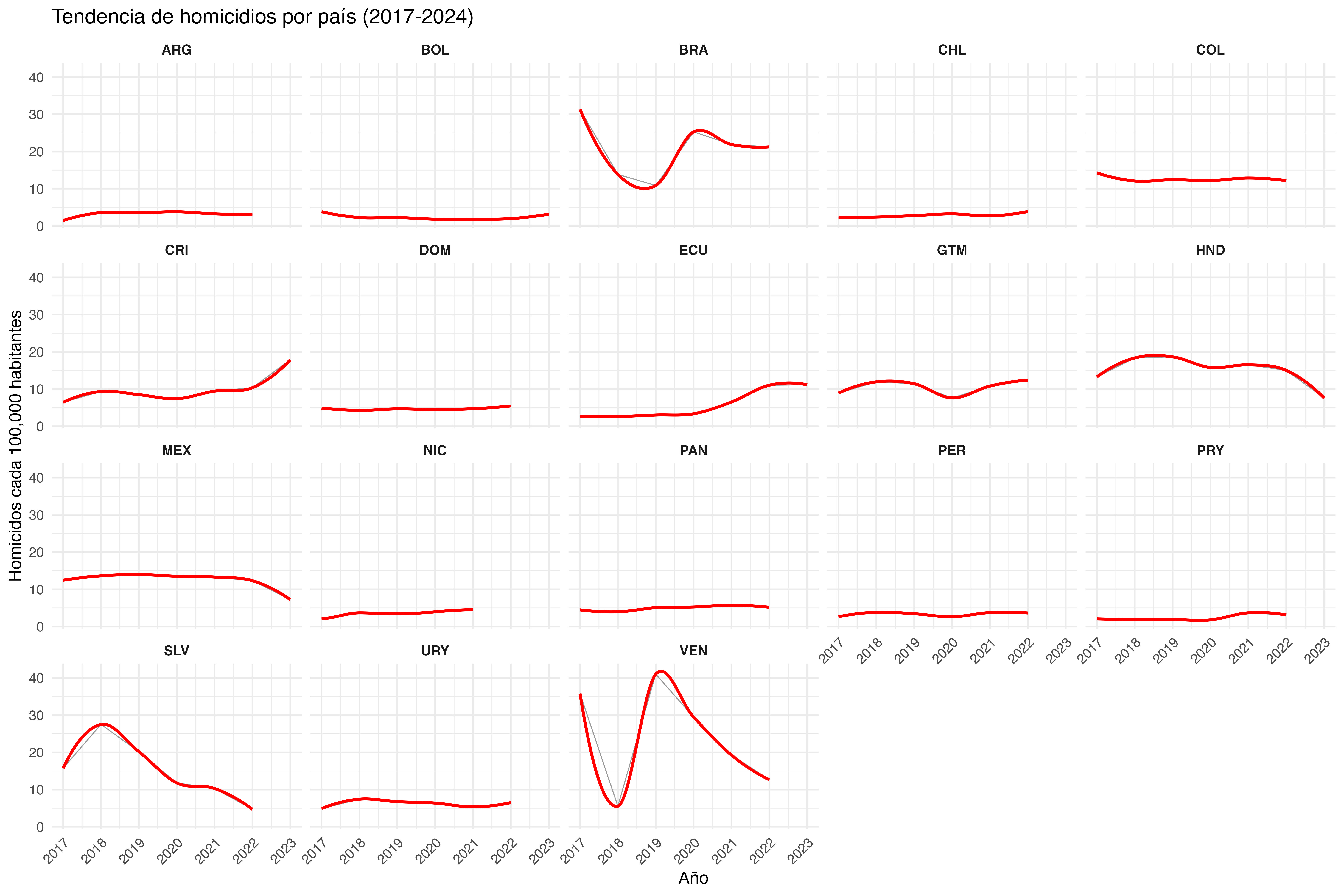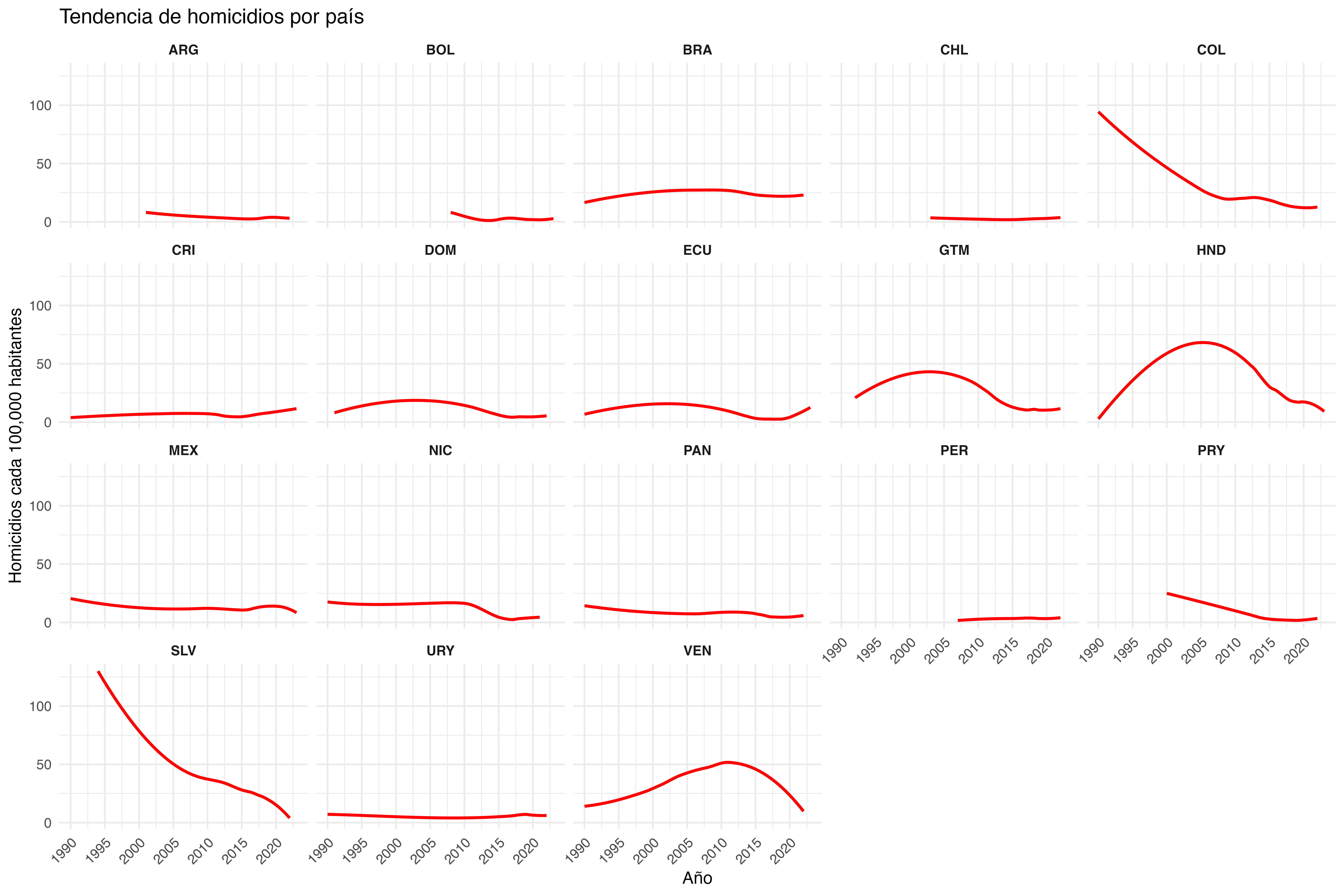 Desde hace ya varias décadas, América Latina y el Caribe se ha transformado en la región con las mayores tasas de homicidio en el mundo (Koonings y Kruijt, 2023; Vilalta, 2020; Cavalari, Manjarrés y Newton, 2025), aunque, como discutimos a continuación, las tendencias a través del tiempo son heterogéneas entre los países. Respecto a esto último, cabe realizar dos aclaraciones adicionales. Por un lado, existe una fuerte variación subnacional en las tasas de homicidio, cuya magnitud no es posible visualizar a partir de los datos de que disponemos (los que se encuentran agregados a nivel nacional). Por otro lado, también es relevante entender que la criminalidad organizada no necesariamente induce a mayores niveles de homicidio. En realidad, el negocio criminal funciona mejor en ausencia de violencia visible, cuya manifestación más clara la representan los homicidios (Feldmann y Luna, 2023).