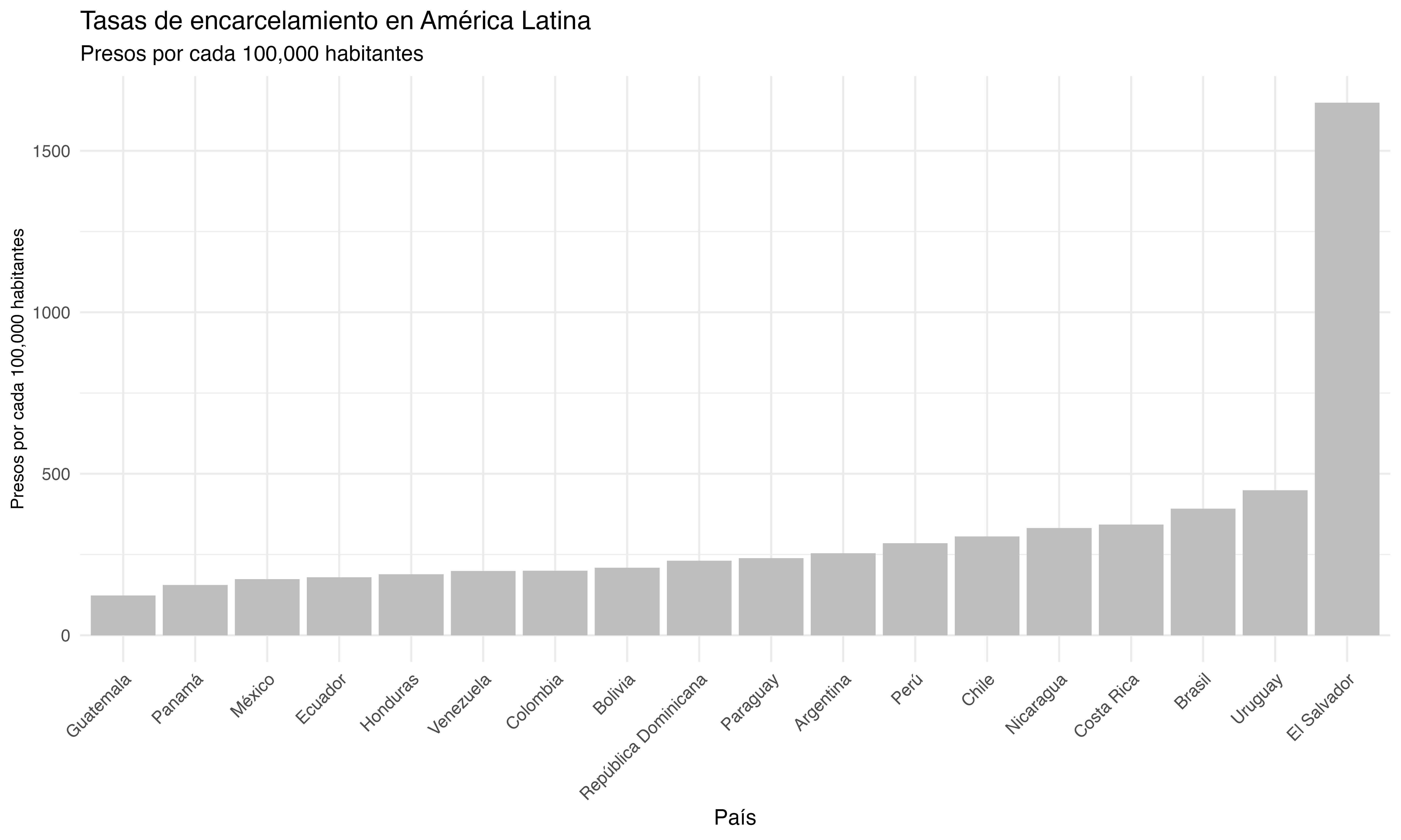 Las tasas de encarcelamiento constituyen otro indicador relevante de la influencia criminal en la región, aun cuando sus implicancias son ambiguas. Por un lado, altas tasas de encarcelamiento reflejan un tipo de política contra el crimen —más o menos punitiva— que algunos países han venido aplicando. Por otro lado, la cárcel en América Latina constituye un factor criminógeno que ha sido central en el fortalecimiento de las organizaciones criminales más poderosas (por ejemplo, las bandas brasileras como el PCC y el Comando Vermhelo, el Tren de Aragua en Venezuela y las varias organizaciones carcelarias de Ecuador) (Lessing y Willis, 2019; Bergman y Fondevila, 2021).