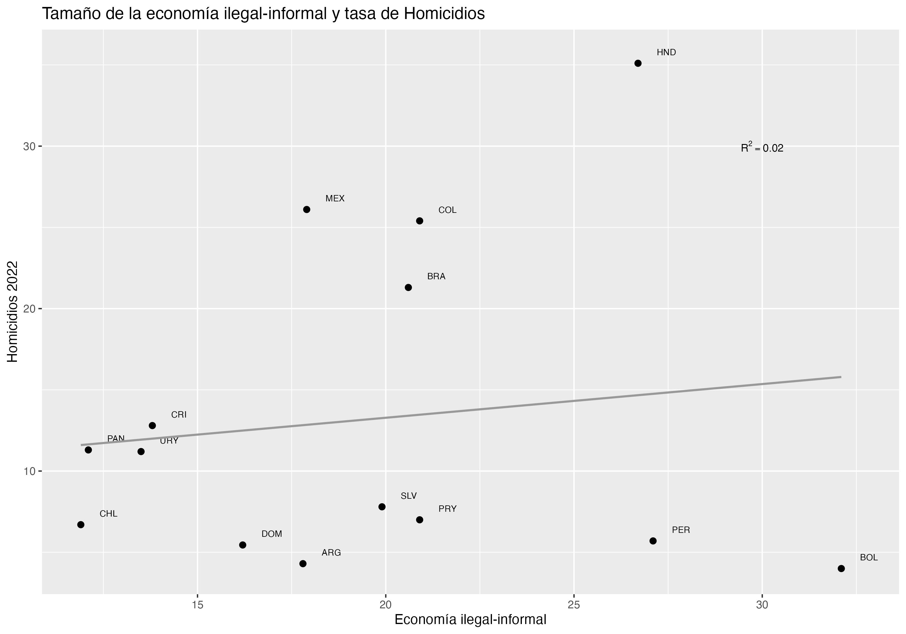 De acuerdo con la información presentada en el gráfico 5, con la excepción de Costa Rica, las economías centroamericanas, así como las de los países andinos y Paraguay registran muy altos niveles de informalidad laboral. Colombia, México, Venezuela, Panamá, Argentina y República Dominicana, por su parte, poseen niveles intermedios de informalidad. Finalmente, Chile, Uruguay, Brasil y Costa Rica poseen los niveles más bajos en la región. La estimación más reciente, elaborada por la consultora Ernst & Young (2025) sobre la base de datos del Fondo Monetario Internacional acerca del alcance de las economías informales e ilegales, refleja una tendencia similar a la registrada por la Organización Internacional del Trabajo (OIT). El gráfico 6 presenta esa estimación alternativa y su relación con los niveles de homicidios observados en América Latina en el año 2022. Como se observa en el gráfico 6, el tamaño de las economías ilegales e informales no tiene una relación significativa con los niveles de violencia observados en cada caso, lo que nuevamente indica la complejidad del fenómeno criminal asociado a la operación de estos mercados.