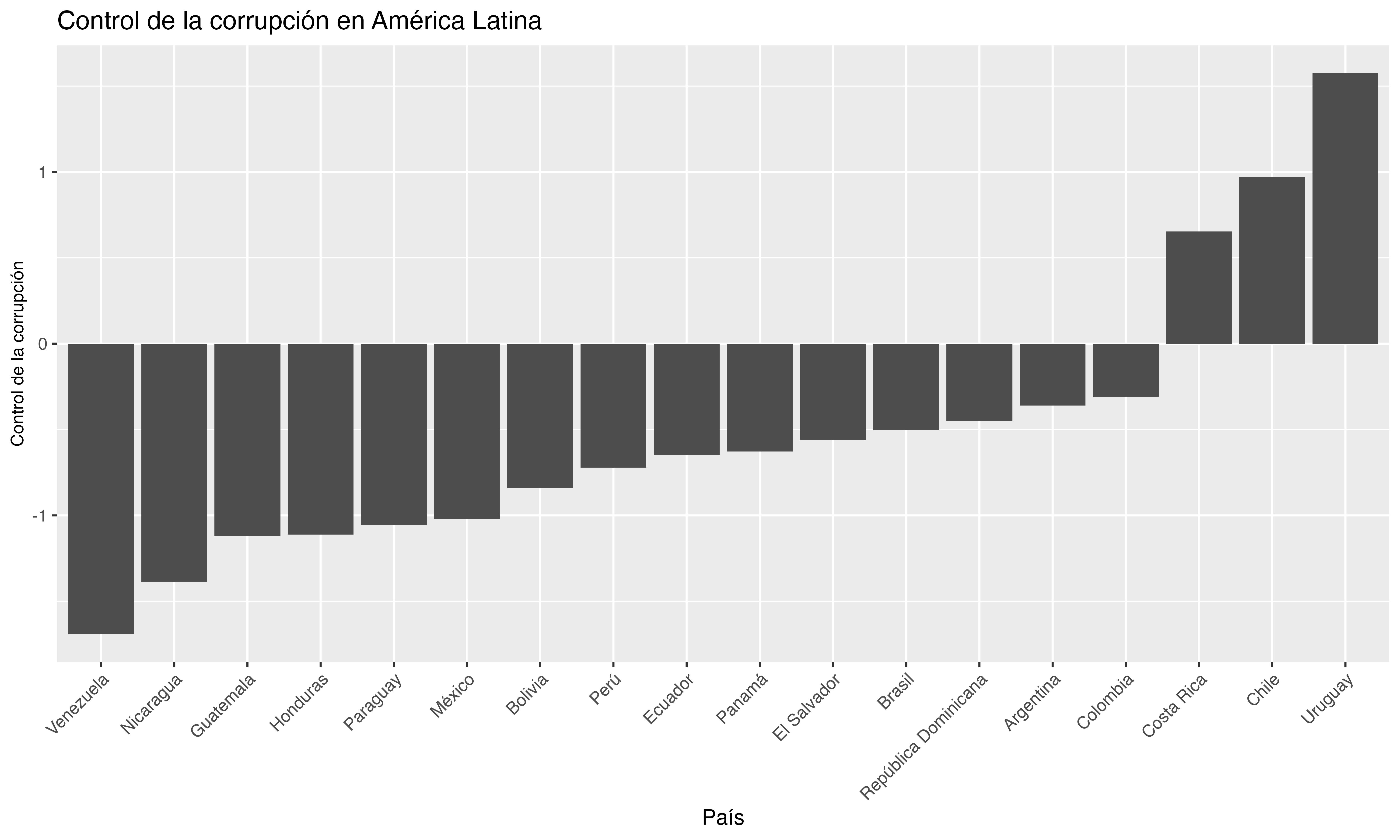 No obstante, en los últimos años distintas organizaciones internacionales han desarrollado índices que dan cuenta de la probable extensión del fenómeno en cada caso. El gráfico 7 presenta los resultados del índice de control de corrupción desarrollado por el Banco Mundial (2024). Este índice considera los esfuerzos de los países para controlar dos tipos de corrupción relevantes por nuestro trabajo: la corrupción de alto nivel —que involucra a las principales autoridades políticas del país— y la corrupción común —que involucra el comportamiento de los agentes estatales a nivel territorial y en áreas funcionales que implican capacidad regulatoria relevante para la consecución de actividades ilegales—.