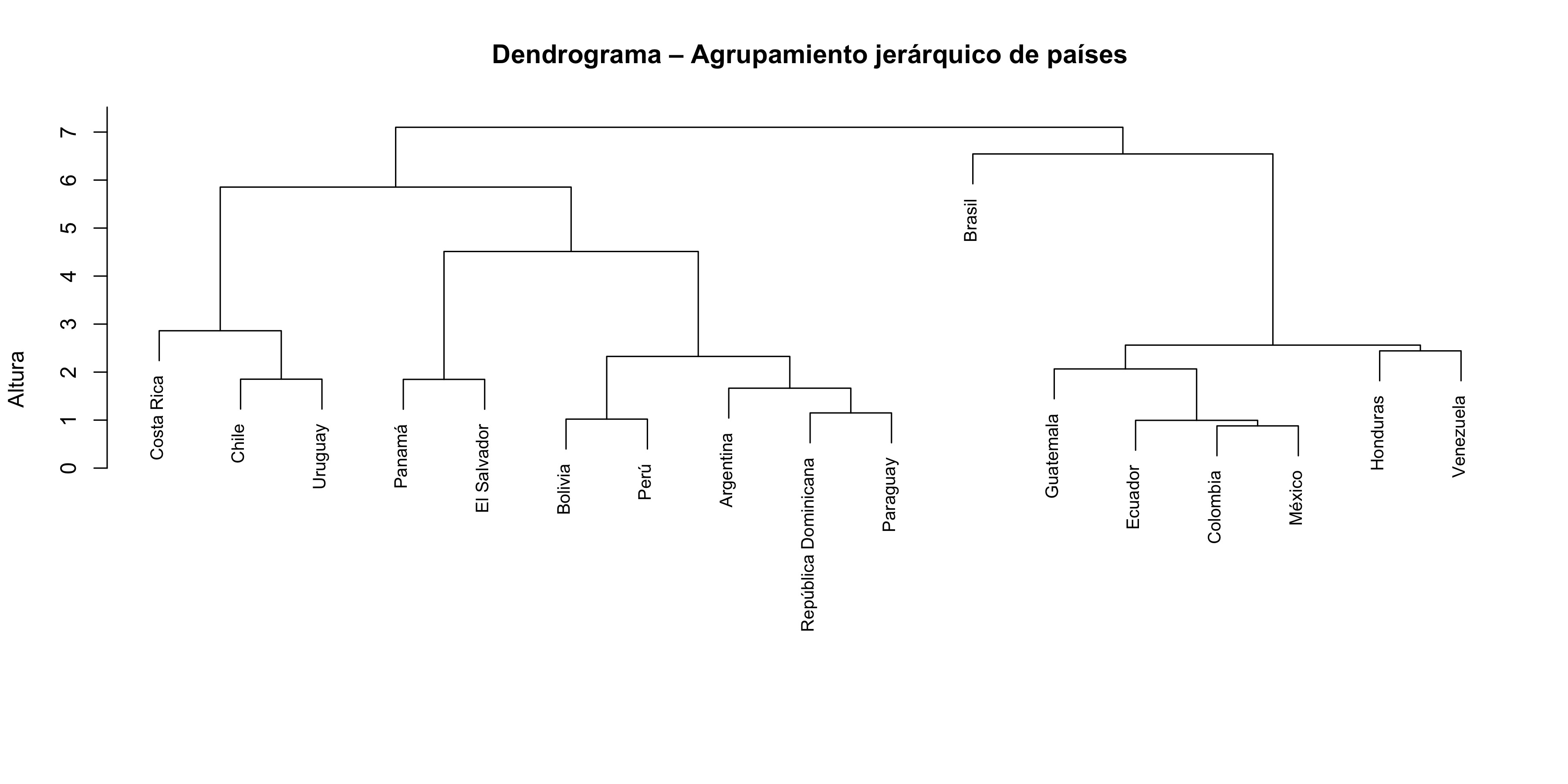 Los seis indicadores analizados en las secciones anteriores dan cuenta de la dificultad de lograr una descripción unificada de las implicancias derivadas de la expansión del crimen organizado y los mercados ilegales en la región. En esta última sección, presentamos una clasificación de países construida sobre la base de la distancia entre casos, estimada al considerar los seis indicadores simultáneamente. Para lograr esta clasificación, primero se estimó la distancia euclidiana sobre la matriz multidimensional conformada por los seis indicadores (cuya varianza fue estandarizada antes de realizar el cálculo de distancias). En segundo lugar, utilizando el método de Ward, construimos un análisis de clúster jerárquico cuyo resultado presenta el dendograma del gráfico 8.