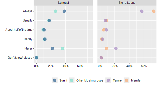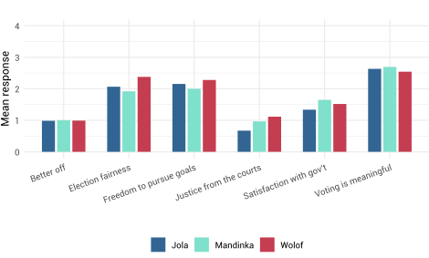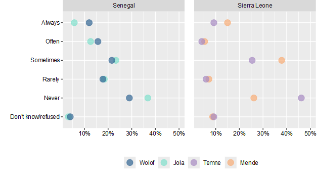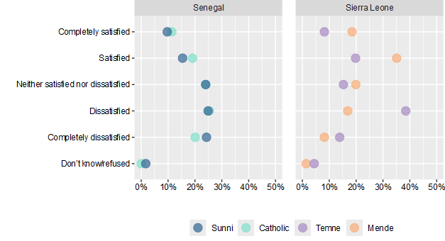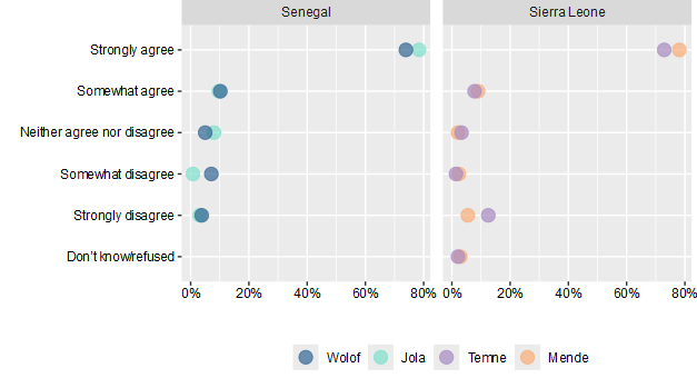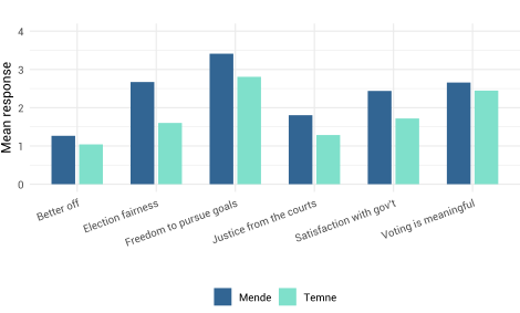 The survey findings show that Sierra Leone exhibits deep ethnic polarization, particularly between the Mende and the Temne groups, which in turn is correlated with perceptions of electoral credibility, government performance and access to justice. These divisions reflect entrenched ethno-political alignments and the legacy of civil conflict and are preserved through ethno-patrimonial networks that tie electoral victory to the provision of state goods. In contrast, Senegal—despite similar ethnic diversity—shows minimal political divisions along ethnic lines, attributed to a history of deliberate civic identity building. While both countries share low confidence in the capability of their respective judicial systems to deliver justice, Senegal’s political cleavages are shaped more by geography and socio-economic inequality than ethnicity.