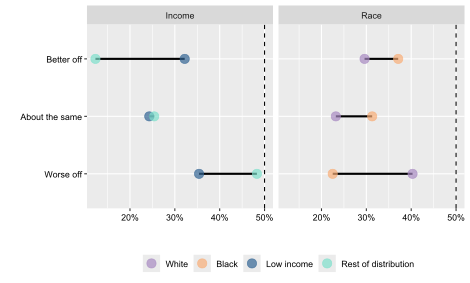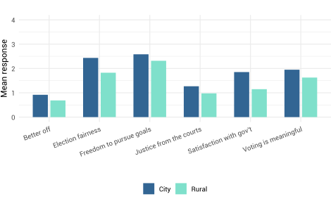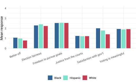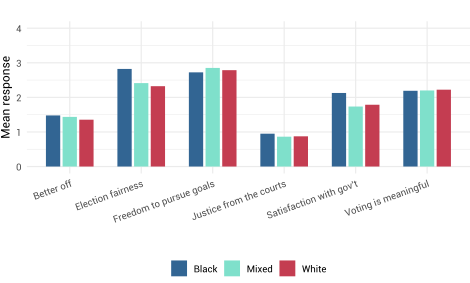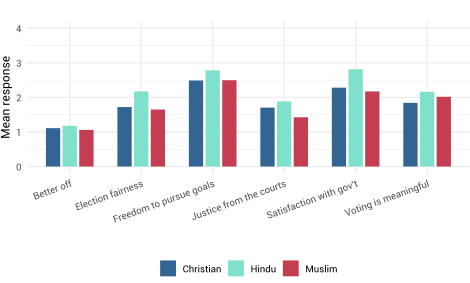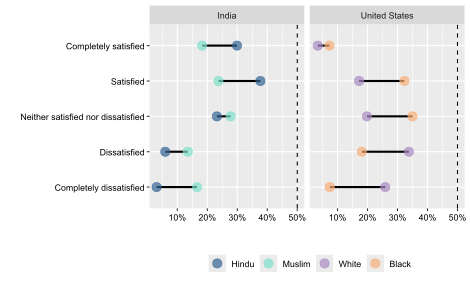 In India, Hindu respondents expressed significantly more confidence in electoral credibility, access to justice and government performance than Christian and Muslim minorities. These differences reflect the country’s political climate under the Bharatiya Janata Party, whose strong rhetorical emphasis on India’s Hindu identity, often reflected in policies, has been perceived as exclusionary by some members of minority groups. In the USA, racial and religious cleavages were less pronounced than initially expected, with minimal variation in perceptions of electoral credibility and access to justice across racial groups. However, significant divides emerged along geographic and partisan lines: rural and Protestant respondents—groups more likely to support Donald Trump—expressed greater scepticism about democratic institutions and economic progress than urban and non-religious respondents. These findings suggest that, while India’s cleavages are rooted in religious identity and perceived institutional exclusion, the USA’s divisions are more shaped by political polarization and elite-driven narratives.