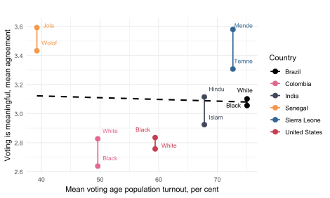 In some countries, cleavages along these lines are acute and well documented, such as Sierra Leone’s division of politics along a north–south, Temne–Mende ethnic axis. In similarly multiethnic Senegal, however, ethnicity is largely politically inconspicuous but may still play a role in how the country’s democratic institutions are perceived. In other countries, the political relevance of these ethnic and religious divisions is itself contested. Brazil, for example, is sometimes heralded as a ‘racial democracy’, where white, Black and racially mixed Brazilians enjoy equal access and influence, while also being a country where real systemic and structural violence disproportionately affects the country’s non-white population (Schwartzman 2020). Neighbouring Colombia has a similar demographic make-up, and racial profiling and discrimination are persistent problems. However, the country’s violent 20th century may indicate that other cleavages such as geography, poverty and gender may be more salient (Uprimny 2011; Ikawa 2017; Laurent 2018).