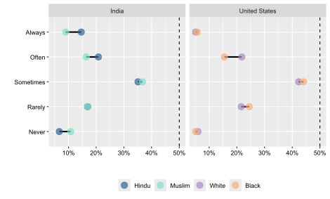 Similarly, race has historically been an axis on which politics in the USA has turned, and the persistence of Jim Crow laws continue to profoundly affect the everyday lives of Blacks and other racial and ethnic minorities (Coates 2014). That American politics turns on questions of race and ethnicity does not necessarily mean that Americans are divided along racial or ethnic lines, and this report will also examine alternative social cleavages. In India—like the USA, a vast, diverse federal democracy—the primary cleavage is not race or ethnicity but religion. Similarly, this is not to say that Indians are divided strictly along religious lines; rather, they are divided between competing visions of a dominant civic or Hindu nationalist identity (Vaishnav 2024).1