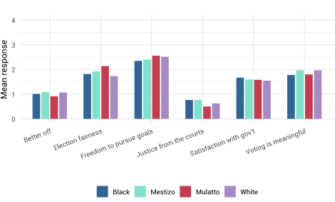 In Brazil, the most prominent social cleavage observed is religious: Protestant respondents expressed significantly more scepticism about electoral credibility and government performance than Catholics and non-religious groups. However, the fact that Evangelical Protestants are a major source of support for former President Jair Bolsonaro likely reflects partisan alignment more so than religious division. Racial divisions, while present in broader societal structures, did not manifest strongly in perceptions of democracy. In contrast, Colombia displayed more uniform pessimism across social groups, with minimal variation by race or religion. Instead, the legacy of armed conflict and displacement and accompanying economic inequality appears to be the dominant cleavage, particularly affecting low-income respondents, who consistently expressed more negative views on justice, economic progress and democratic institutions.