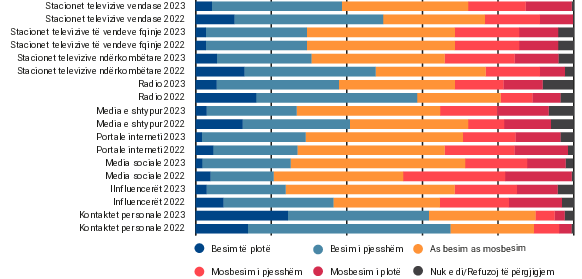 Besimi në media është në rënie të vazhdueshme. Sondazhi i lartpërmendur nga Fondacioni Metamorfozis (shih Figurën 3.1) tregon se më shumë se 64 përqind e popullsisë informohet çdo ditë duke folur me kontaktet e tyre personale. Ky është i vetmi burim informacioni që tregon një rritje të ‘besimit të plotë’ gjatë kësaj periudhe (me një rënie të lehtë të qëndrimeve të kombinuara të besimit të plotë ose ‘disi’). Besimi publik në median tradicionale (stacionet televizive, radio dhe media e shtypur) është më i lartë se ai i vendosur në median digjitale. Konkretisht, 39 përqind e qytetarëve u besojnë plotësisht ose disi stacioneve televizive vendase, 30 përqind u besojnë stacioneve televizive nga vendet fqinje, 21 përqind u besojnë stacioneve televizive ndërkombëtare, 38 përqind u besojnë stacioneve radiofonike, ndërsa 27 përqind u besojnë medias së shtypur.