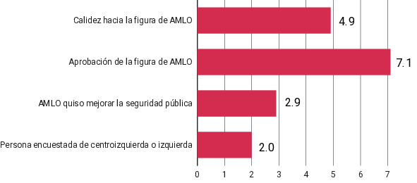 La segunda variable más importante fue la expresión de un sentimiento favorable hacia el propio presidente López Obrador, lo que multiplicaba casi por 5 la probabilidad de preferir a la candidata de Morena. Este indicador de la dimensión afectiva comprende también la identificación que una buena parte del electorado expresó experimentar con el presidente8.