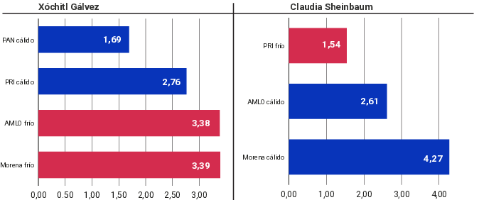 Sin embargo, en la elección de 2024, de cuatro evaluaciones afectivas consideradas, en la preferencia por Sheinbaum pesaron más los sentimientos positivos que los negativos: expresar un sentimiento cálido hacia el presidente López Obrador multiplicó 2,6 veces la probabilidad de votar por Sheinbaum, en tanto que tener sentimientos cálidos hacia el partido Morena multiplicó esa probabilidad por 4,2 (FLACSO México e ISA, 2024). En lo que respecta a la preferencia por la candidata opositora, tener sentimientos fríos hacia López Obrador y hacia Morena multiplicó por 3,3, en cada caso, la probabilidad de optar por Xóchitl Gálvez, y el efecto de estas variables fue superior al de los sentimientos cálidos hacia los partidos de la coalición opositora. Dicho de otra manera, entre quienes votaron por la oposición la animadversión tuvo más peso que la simpatía (figura 2).