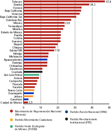 En cuanto al formato de la competencia y el sistema de partidos, coexisten márgenes de victoria muy amplios con márgenes de victoria bajos. En Tabasco y Sinaloa, por ejemplo, dos estados con un perfil socioeconómico y regional muy diferente, Morena fue el partido ultramayoritario y aventajó a sus rivales por 47 y 38 puntos porcentuales, respectivamente. En Querétaro y la Ciudad de México, dos estados espacial y socioeconómicamente menos diferentes, el PAN y Morena lograron sus mayorías por una ventaja de apenas 2,8 y 2,5 puntos porcentuales, respectivamente. En estas cuatro entidades hubo un total de ocho partidos registrados, a excepción de Sinaloa, donde se registraron nueve partidos, cifras muy similares a las observadas a nivel nacional, donde se registraron siete partidos (figura 4).