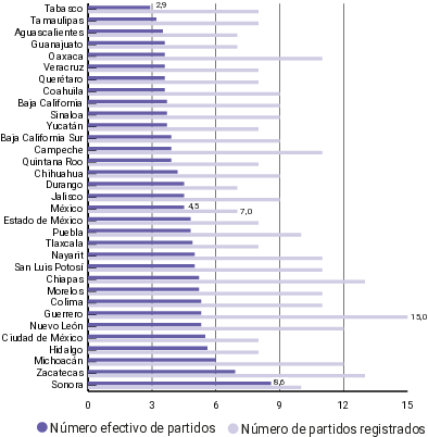 Sin embargo, el número efectivo de partidos sí fue sensiblemente distinto: en Tabasco el total fue de apenas 2,9, el más bajo de todo el país, mientras que en la Ciudad de México llegó a 5,5. Las entidades que presentaron mayor diversidad en cuanto a las opciones reales de competencia fueron Sonora y Zacatecas, donde se contabilizaron 8,6 y 6,9 partidos efectivos, respectivamente. Zacatecas y Guerrero, además, fueron los estados que más opciones partidistas formales incluyeron en sus boletas (13 y 15 partidos, respectivamente). Finalmente, con pocos partidos en competencia, figuraron Tamaulipas y Aguascalientes (figura 4).