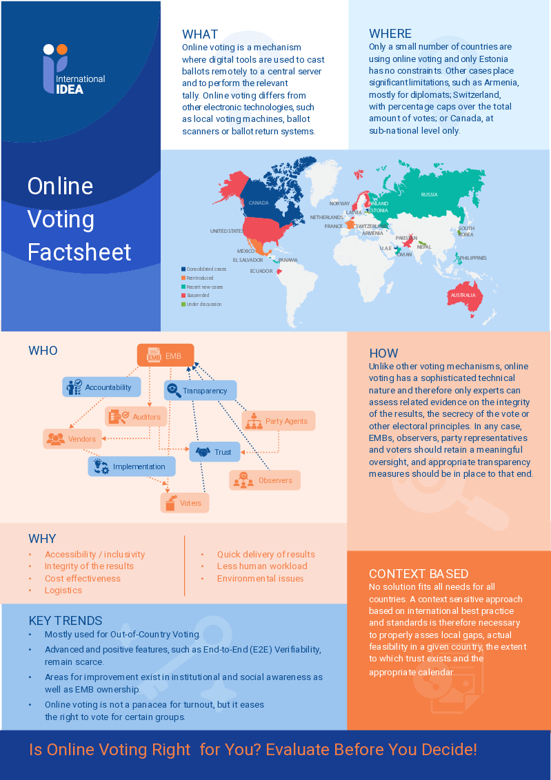 In recent decades, in parallel with the development of Internet services, online voting has gained prominence as an innovative channel that could address recurrent election gaps in terms of accuracy, accessibility or fraud, among other things. While its advantages seem very apparent, there are also risks, and the balance among early implementors was inconclusive. Successful cases from both democratic and less-democratic countries have been recorded together with important failures, for a wide range of reasons often unrelated to technical problems. Other factors have had an important role, such as the legal framework, the level of electoral management body (EMB) in-house expertise, time pressures and voter education.
