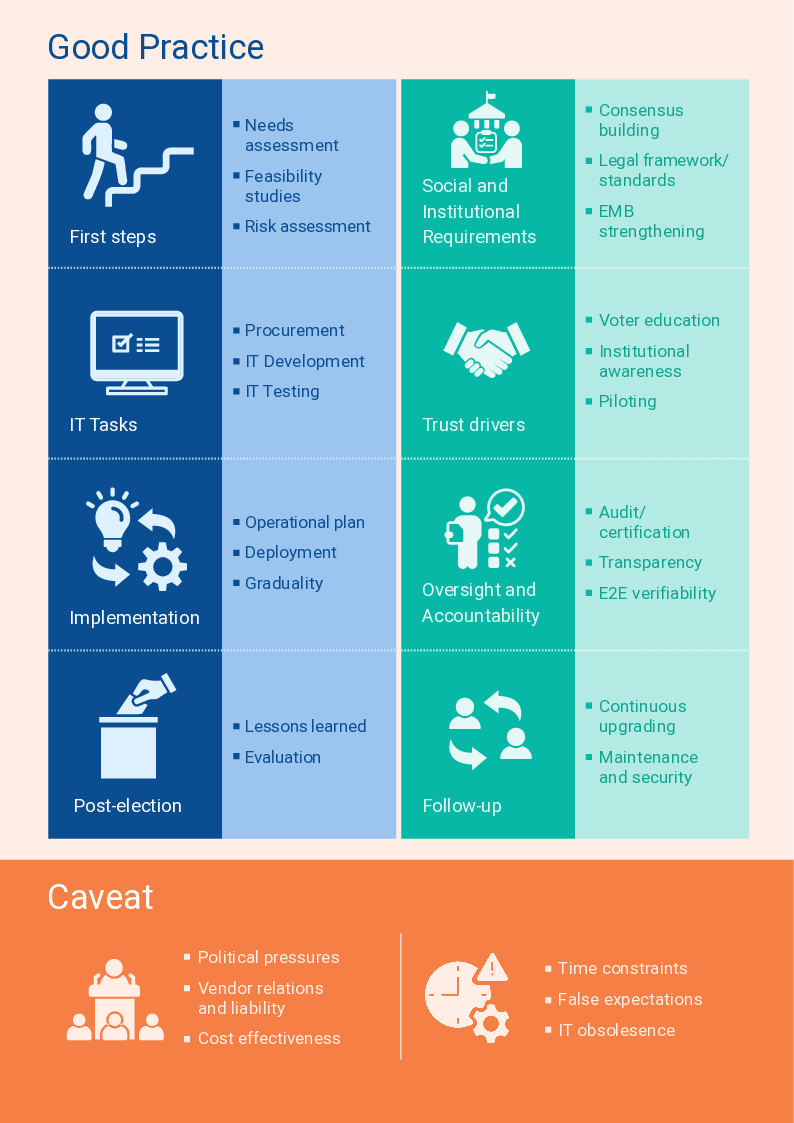 Despite the technical nature of online voting initiatives, institutional factors must be considered at a very early stage, since they will condition the entire project and become triggers of failure or success. In this regard, online voting needs a context-based approach so that general patterns are duly tailored to local scenarios. Clear ideas on the electoral gaps to be resolved and feasibility studies to identify constraints will be crucial. Assessing the in-house expertise of the EMB, together with the legal framework and how crisis scenarios are handled, could provide an initial understanding of where the constraints might be in a given country, and the project could be adjusted accordingly.