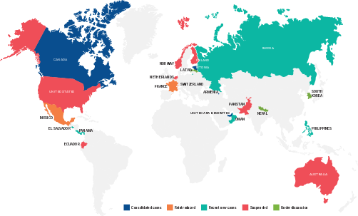 1. Armenia 2. Canada 3. Estonia 4. United Arab Emirates | 5. France 6. Mexico 7. Switzerland | 8. El Salvador 9. Oman 10. Panama 11. The Philippines 12. Russia |