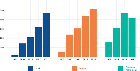 The second round of the parliamentary elections in 2024 registered 459,539 online votes (416,601 in the first round), which represents 77.65 per cent of the ballots cast from the relevant constituencies (72.58 per cent in the first round) and 29.37 per cent of the turnout (26.53 per cent in the first round) (MEAE 2024a, 2024b).