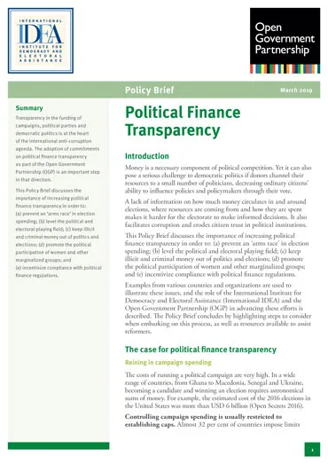 This Policy Brief discusses the importance of increasing political finance transparency in order to: (a) prevent an ‘arms race’ in election spending; (b) level the political and electoral playing field; (c) keep illicit and criminal money out of politics and elections; (d) promote the political participation of women and other marginalized groups; and (e) incentivize compliance with political finance regulations.