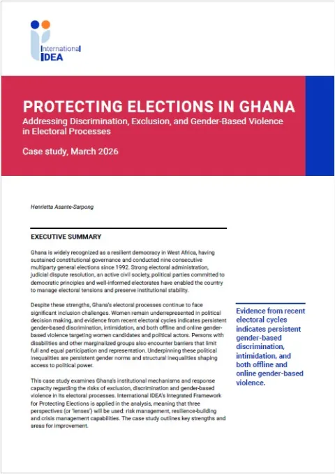 Grounded in decades of research and practice, and informed by International IDEA’s global expertise, this publication offers insights about methods and tools for assessing risks and vulnerabilities, designing effective interventions and promoting inclusive, credible electoral processes. It encourages collaboration among institutions and stakeholders to build sustainable, gender-sensitive and context-appropriate responses to evolving electoral challenges. Ultimately, the Guide aims to foster greater confidence in elections as the foundation of democratic governance.