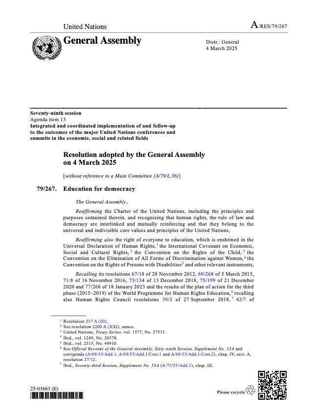 Education for democracy: Resolution adopted by the General Assembly
