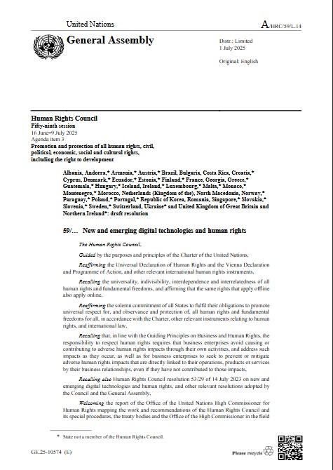 Draft resolution / Albania, Andorra, Armenia, Austria, Brazil, Bulgaria, Costa Rica, Croatia, Cyprus, Denmark, Ecuador, Estonia, Finland, France, Georgia, Greece, Guatemala, Hungary, Iceland, Ireland, Luxembourg, Malta, Monaco, Montenegro, Morocco, Netherlands (Kingdom of the), North Macedonia, Norway, Paraguay, Poland, Portugal, Republic of Korea, Romania, Singapore, Slovakia, Slovenia, Sweden, Switzerland, Ukraine and United Kingdom of Great Britain and Northern Ireland.