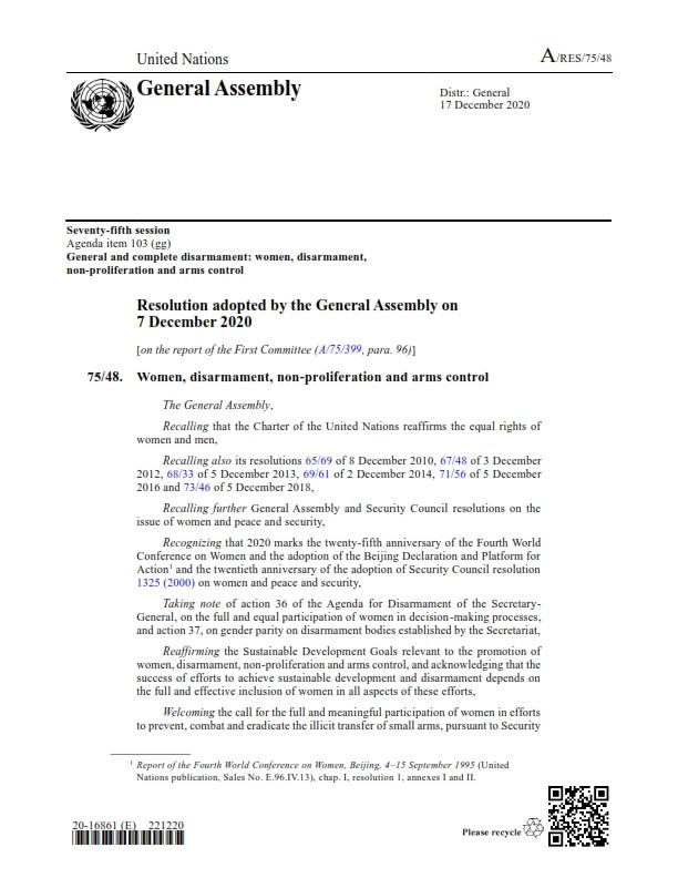In summary, the resolution highlights the importance of women's full and equal participation in disarmament, non-proliferation, and arms control, recognizing their vital role in achieving sustainable peace and security. It calls for greater inclusion and representation of women in decision-making and policy implementation processes and emphasizes the need for international collaboration and support in these efforts.